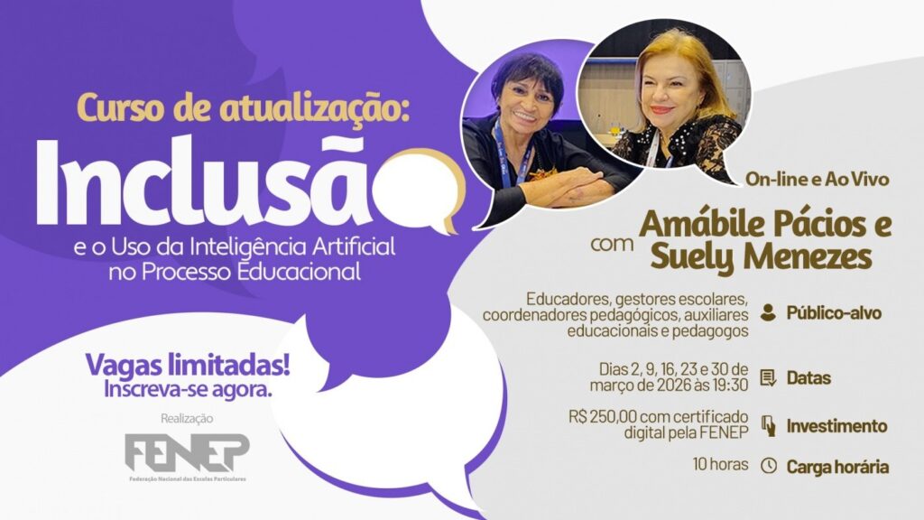 A Federação Nacional das Escolas Particulares (Fenep) promove o Curso de Atualização em Inclusão e Uso da IA. A iniciativa visa o aprendizado na prática sobre como aplicar as novas diretrizes e utilizar a Inteligência Artificial como aliada na personalização do ensino, na organização pedagógica e na gestão escolar. O evento é online, transmitido pelo […]
