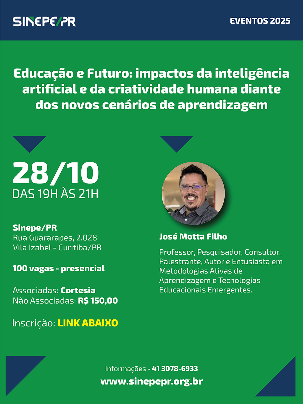👉 19h30 – Abertura com o Presidente do Sinepe/PR, Haroldo Andriguetto Júnior. Palestra com Prof. José Motta Filho.